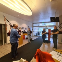 Zum ersten Mal in diesem Jahr dürfen wir uns wieder “life“ treffen und zusammen spielen! Wir haben es sehr vermisst. Das Proben per Skype konnten wir mit Ach und Krach auf dem Chanter machen, doch auch dort waren uns Grenzen gesetzt. Ein zusammen spielen war nie möglich, alle mussten einzel nacheinander spielen. Manchmal war nur der Ton vorhanden und dann nur noch ein Bild ohne Ton, tja die Technik hat auch so seine Tücken. Das ging zur Not, doch viel Freude macht es auf Dauer nicht. Aus diesem Grund sind wir jetzt überaus zufrieden und glücklich, dass wir wieder jeden Mittwoch “normal“ zusammen proben dürfen. Fotos |